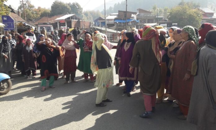 The family and relatives of the woman assembled at Achabal and shouted slogans in support of their demanded for “immediate action against the in-laws for alleged murder of her” at Kehribal Mattan Anantnag.